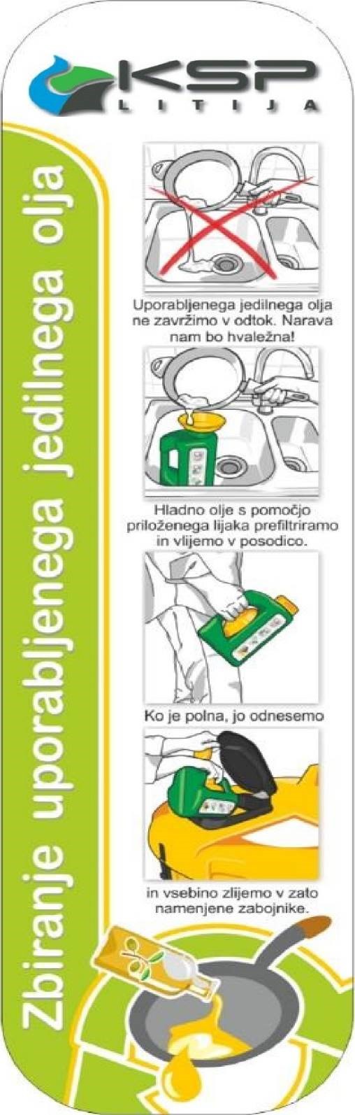 V letu 2018 lahko vsa gospodinjstva iz območja občine Litija in občine Šmartno pri Litiji prevzamejo namenske posode za ločeno zbiranje odpadnega jedilnega olja. S tem želimo zmanjšati količine odpadnega jedilnega olja, ki se odlaga med odpadke ali zliva v kanalizacijo in povzroča nepotrebno obremenitev čistilne naprave.