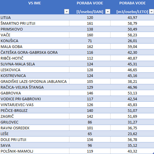 V spodnji tabeli je prikazana povprečna poraba vode na osebo, v litrih na dan oz. v kubičnih metrih na leto, po vodovodnih sistemih v upravljanju KSP Litija d.o.o. Opomba: podatki za leto 2025